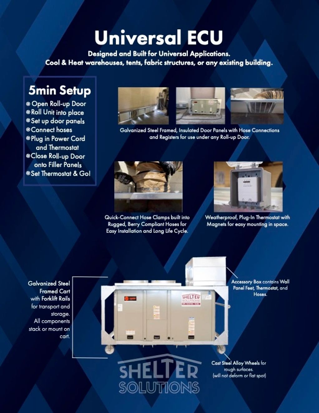Shelter Solutions designs and provides the right Heating, Ventilation and Air Conditioning (HVAC) system for your Shelter needs. We can use Combo Units, Split Systems, AHU's and PTAC's. HEPA Filtration or Once-Through Systems can be utilized if needed. We will work with you to make sure that you have the correct system to adequately Heat, Cool and ventilate your Shelter to applicable codes and your comfort requirements.